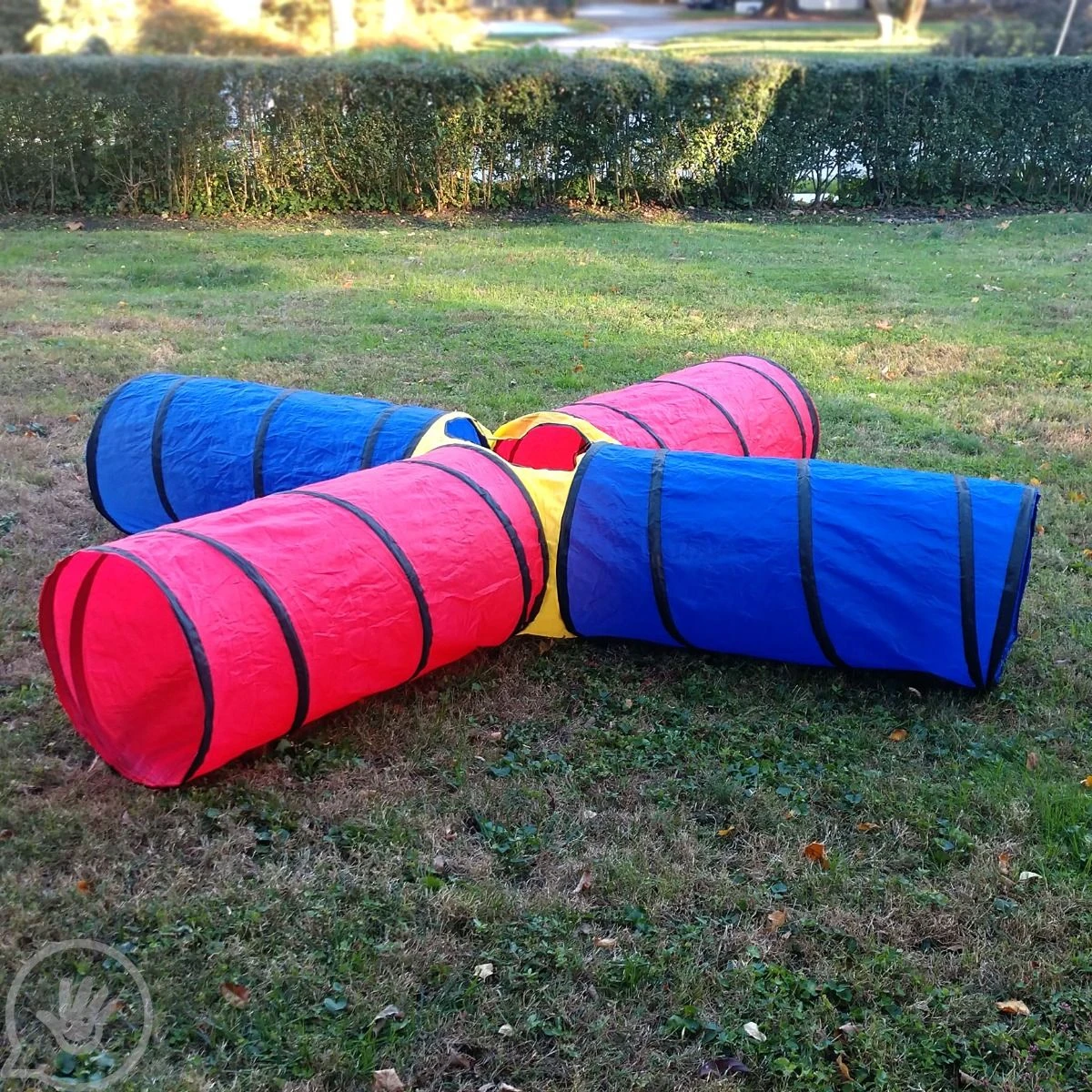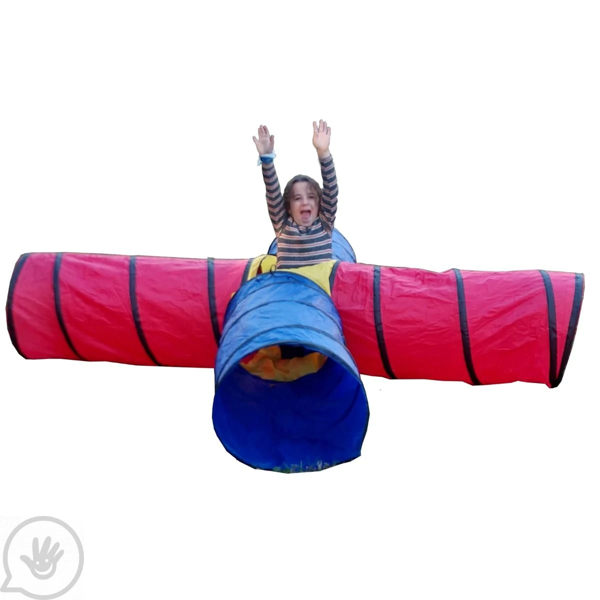 Why choose a straight tunnel when you can crawl through a cool 4-Way Play Tunnel instead? Kids work their shoulder, arm and leg muscles as they crawl or slither through a colorful maze of interconnected tunnels. Since the individual tunnel segments are shorter than standard-sized tunnels, the 4-Way Play Tunnel is a great activity for kids who may feel anxious in longer tunnels. Kids enjoy a coordination-building workout as they navigate the tunnels and can have fun popping their heads out for a quick âPeekaboo!” when they reach the yellow opening in the center. Folds flat and includes a zippered travel case for easy storage
