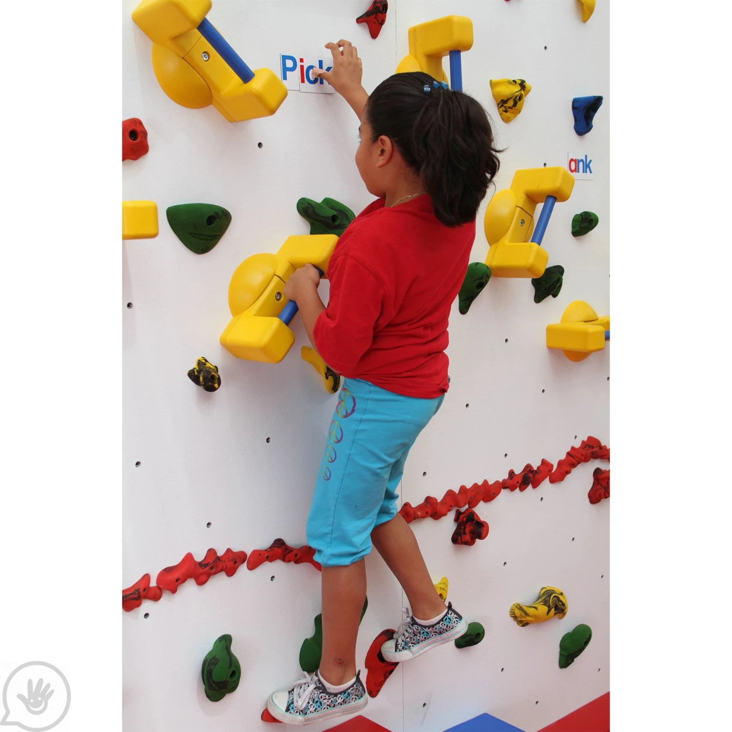 - Includes wall section with 66 preset placement options for mounting hand holds, 20 hand holds, 6 adaptive climbing holds (4 yellow grab bars, 1 blue foot ledge and 1 red foot ledge), 66 T-Nuts, letter and number magnets, Red-Relief Line, activity guide and dry erase marker