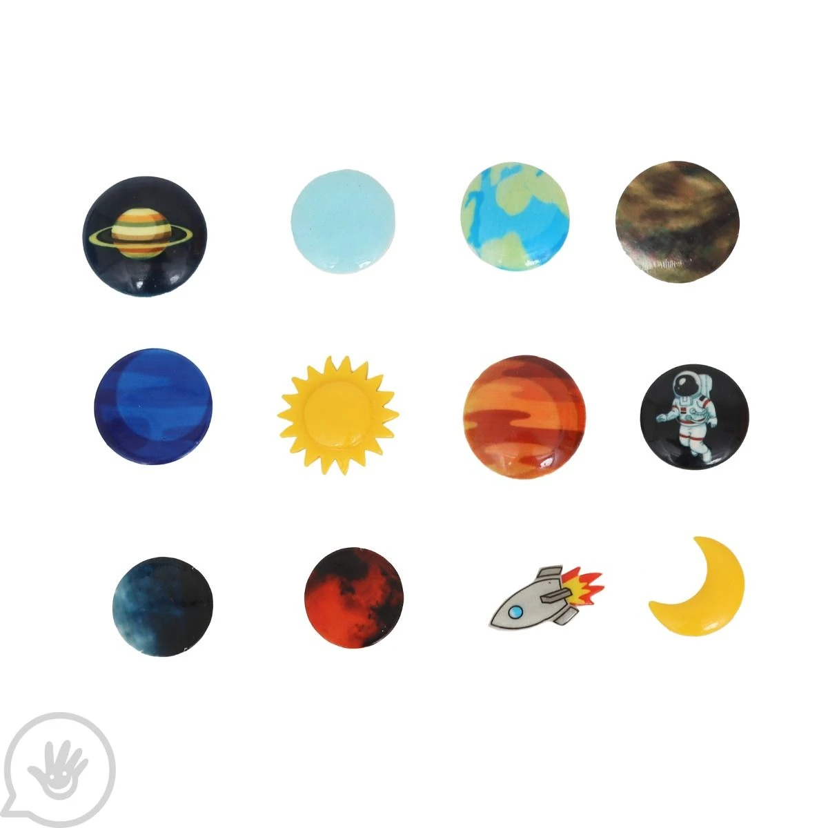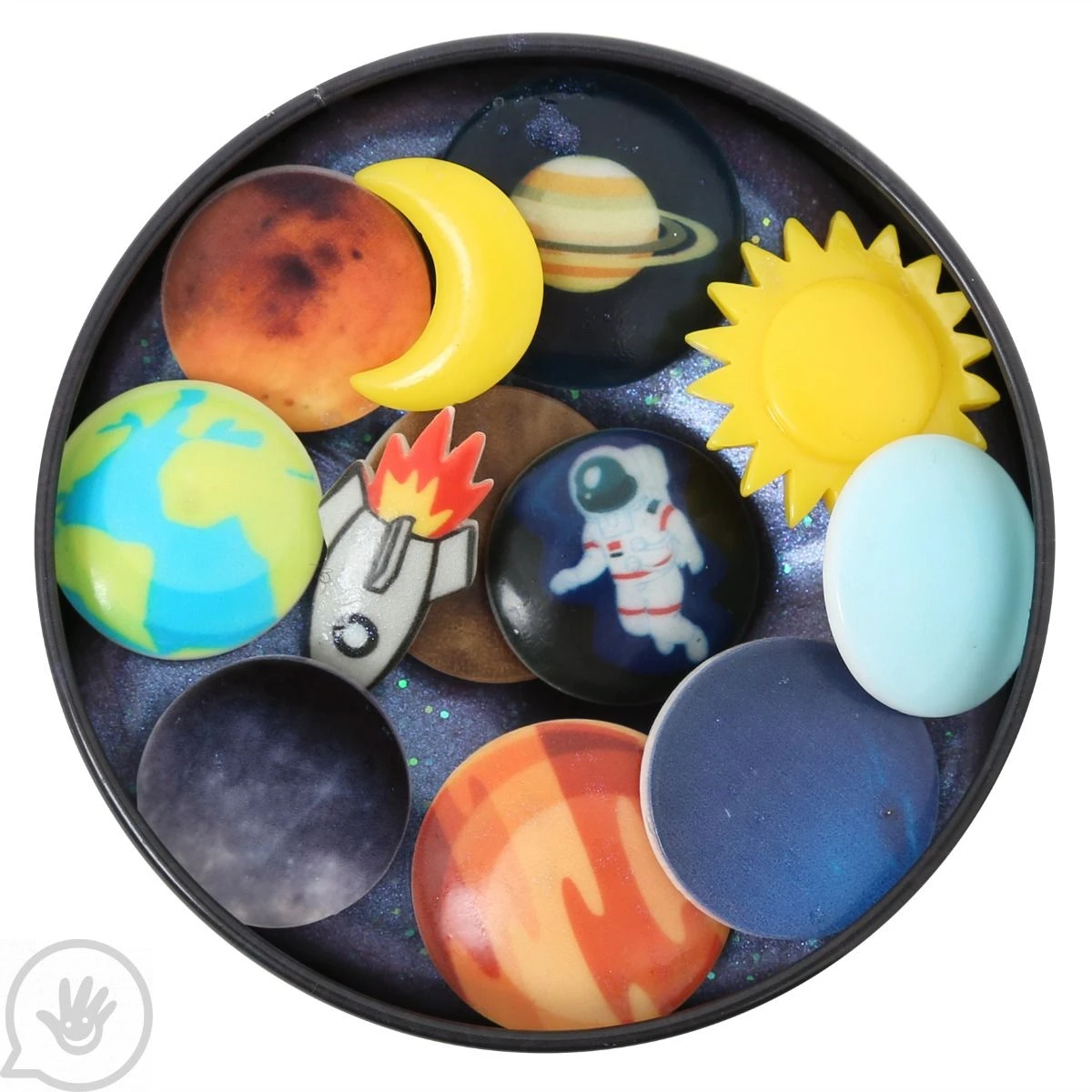 - Includes storage tin, putty and twelve putty pieces: Moon, sun, shooting star, rocketship and eight planets. Pieces may vary.