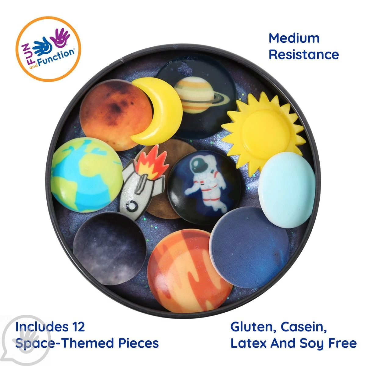 Play hide-and-seek with therapy putty! Each tin comes with 12 space-themed pieces for you to hide and find. To play, select 5-7 pieces and hide them inside the putty. Once they’re out of sight, stretch, mold and pull the putty until you find them all – and then switch out the pieces and play again! To modify the level of difficulty, hide more or fewer pieces. Manipulate the putty and identify the pieces to help develop finger dexterity, promote speech and language skills and keep fidgeting hands busy! Medium resistance.