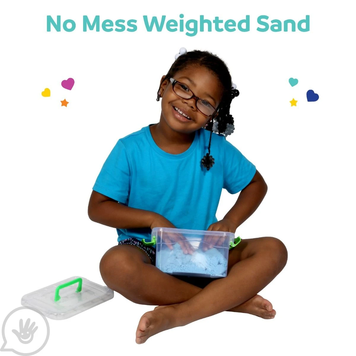 Wake up your hands before handwriting or fine motor work by pressing and squeezing the glittery sensory sand. Expose under responders and over responders alike to the wonders of weighted play sand. Squish the sand into plastic molds (not included) and then release to create interesting 3-D objects. The sparkly sand provides visual stimulation as you squeeze, pack and press it with your hands. The sand feels wet, but is dry and non-stick for easy cleanup. Add to your sensory bin for sensory play that sparkles!