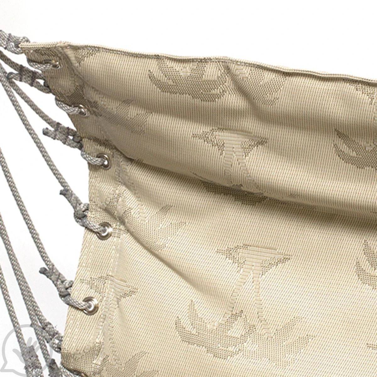 - Polyester ropes, durable fabric with palm tree pattern, varnished dowels and stainless steel hardware