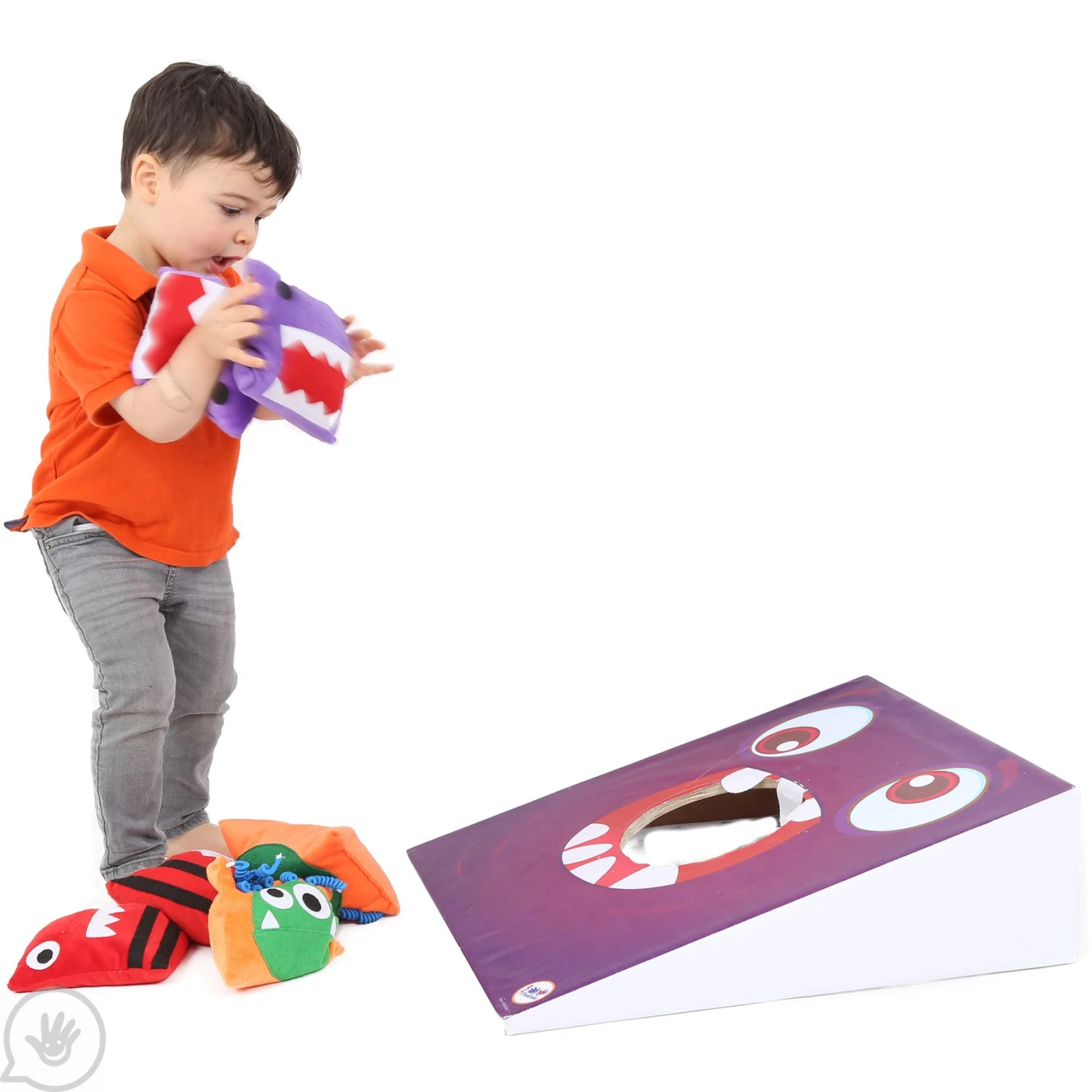 - Stand on a spot marker (sold separately) and aim your monster bean bags (sold separately) into the monster’s mouth. Move the spot marker farther and farther away to increase the challenge
