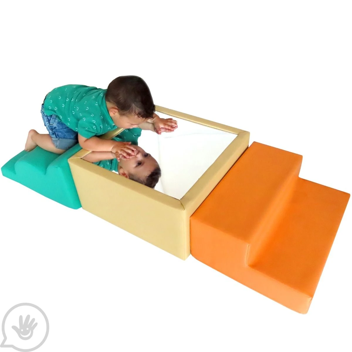 Double the steps for double the fun! Little hands and feet work their way up the straight or wavy steps and greet their own smiling faces when they get to the top! Babies and toddlers safely explore their newfound motor skills while they crawl up and down the cushioned steps and learn about facial expressions as they observe their reflections in the mirror. Use equipment as shown or mix it up and create your own SensaSoft obstacle course! This three-in-one climber promotes movement and cognitive development, making it the perfect addition to your playroom or early childhood classroom!