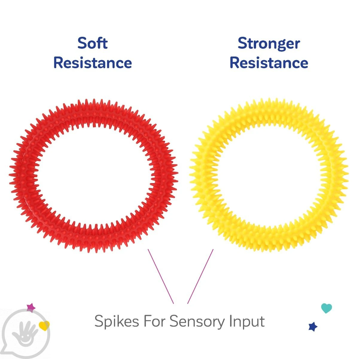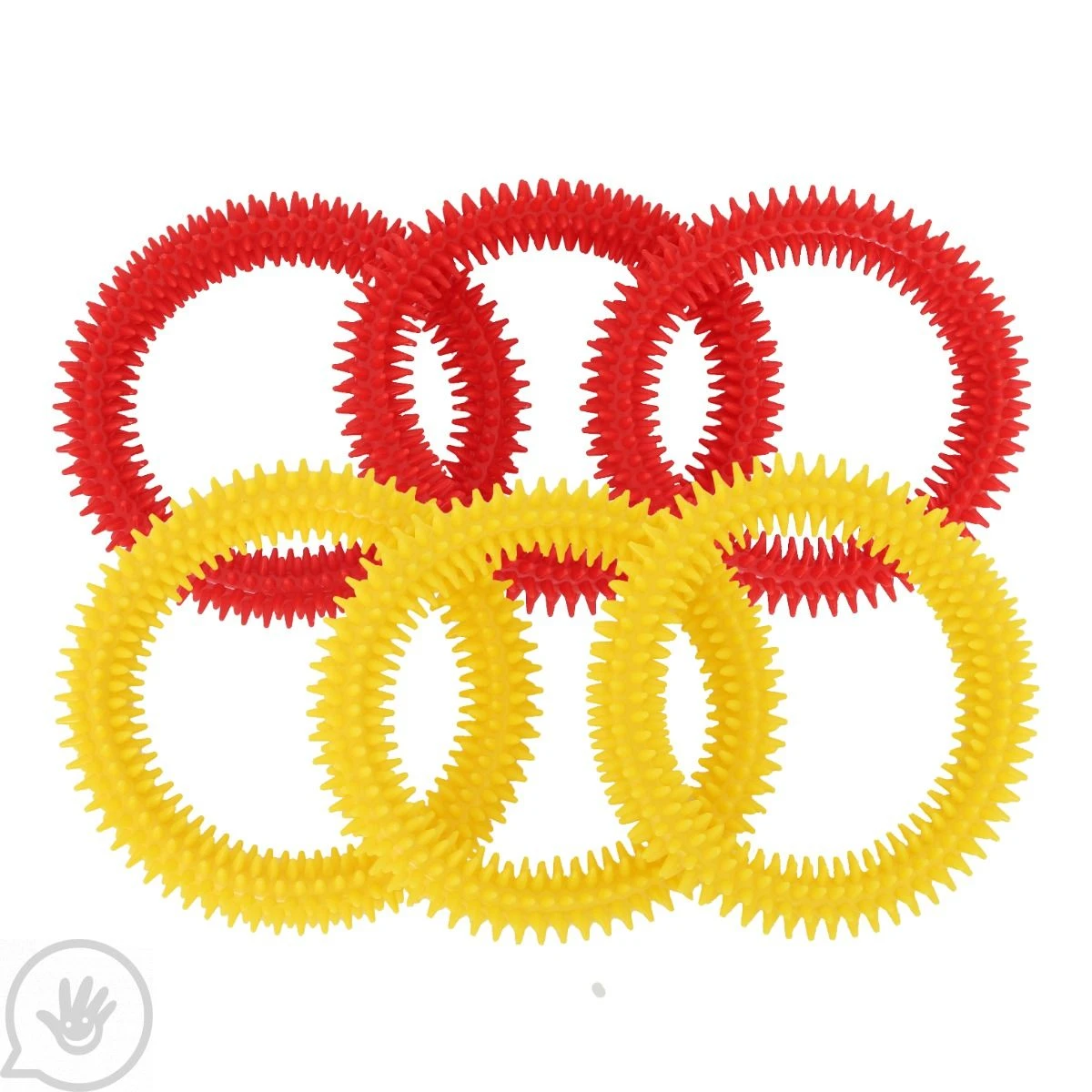 Squeeze, twist and grab these fun-to-feel rings! Both kids and adults love the gentle sensory input of these spiky twists. Rub the spikes for tactile exploration and squeeze the rings to strengthen grip. The yellow rings offer medium resistance and the red rings offer soft resistance. Easy to hold, Sensory Twists appeal to kids of many abilities for tossing, fidgeting, manipulating and hand-eye coordination activities.