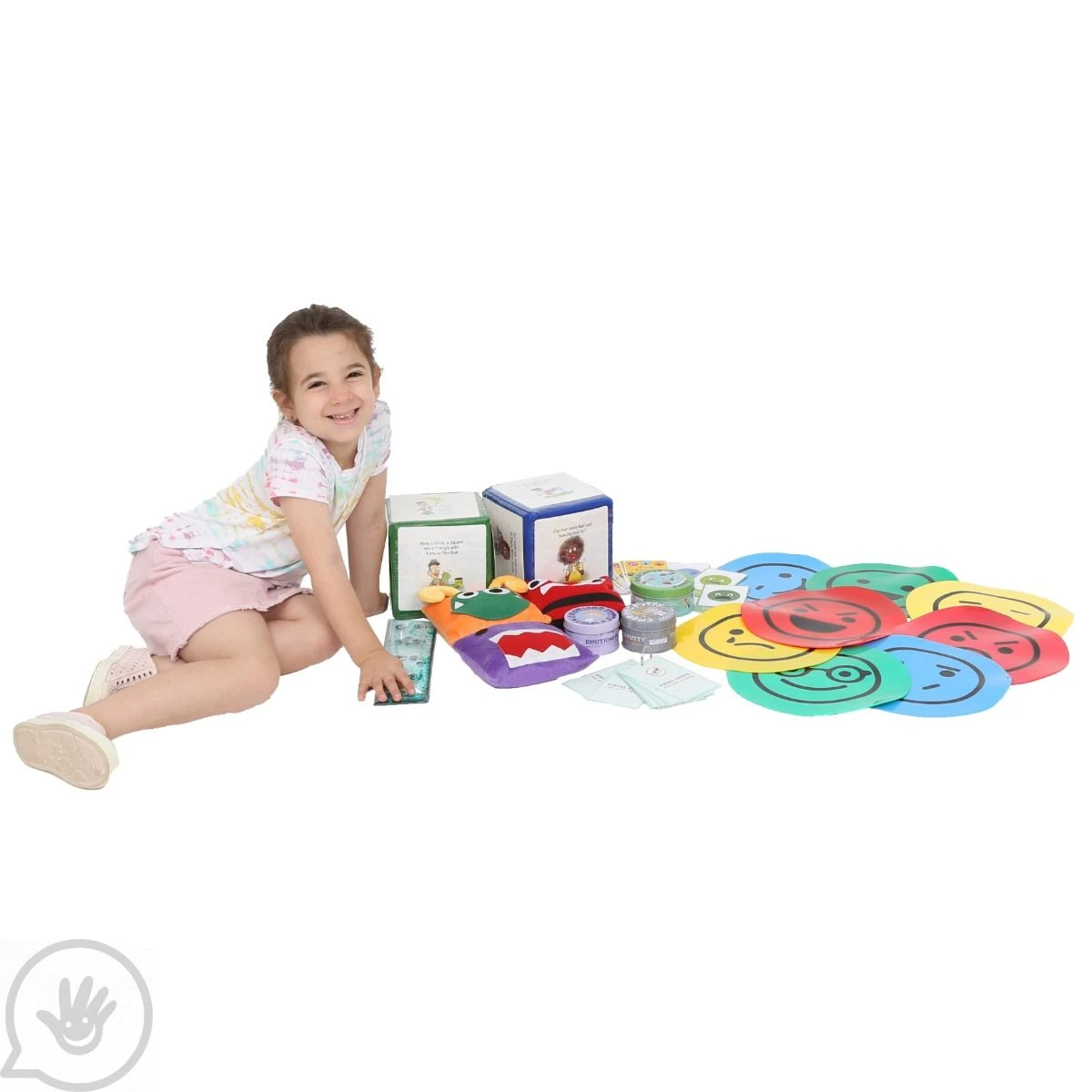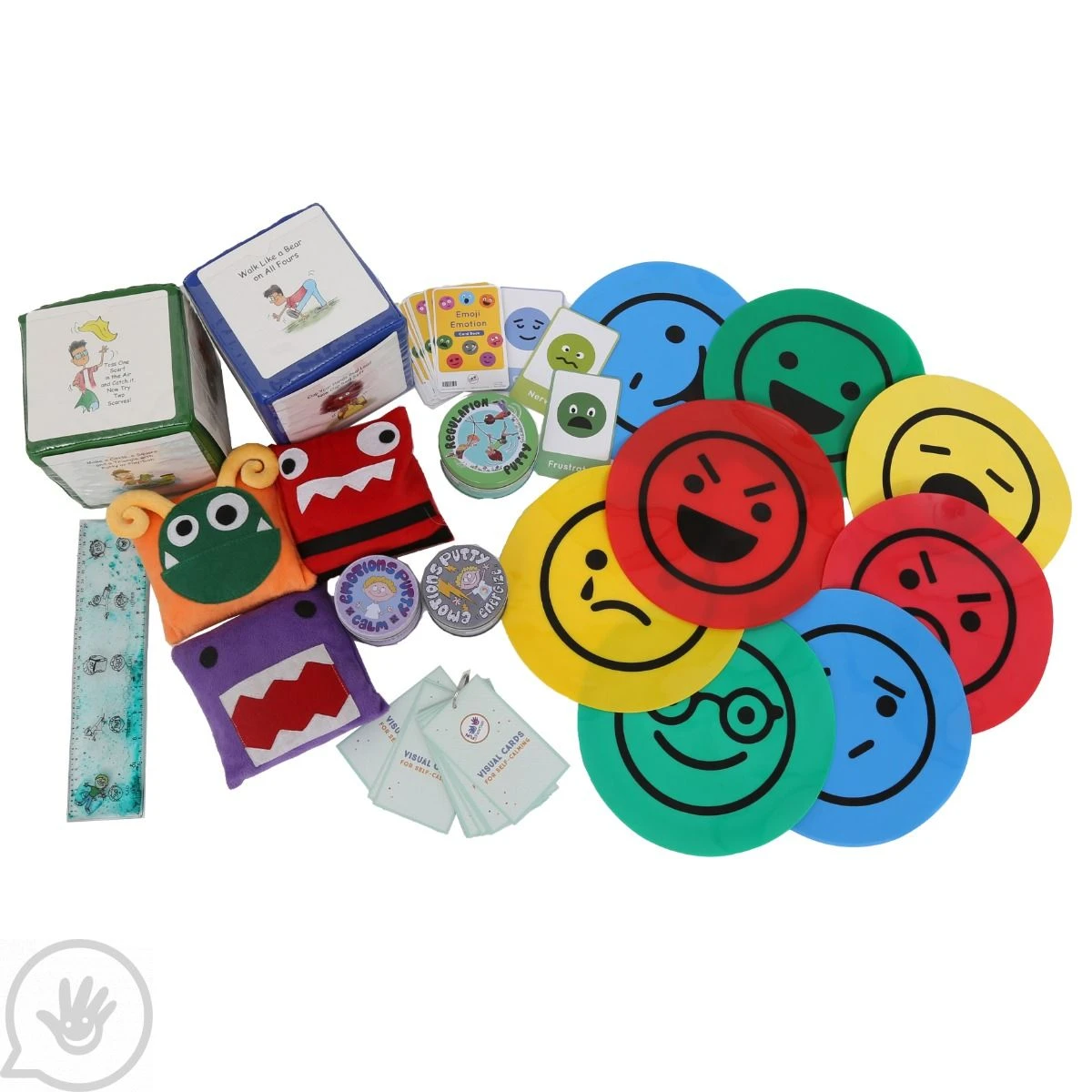 - Includes container, Busy Fingers Fidget Lap Pad, Emotion Balls, Discovery Putty Emoji Expressions, Emoji Emotions Card, Emoji Spot Markers, Emoji Calm Down Jar, Regulation Cubes.